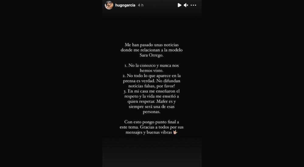 Sin embargo, en ese entonces, Hugo García salió a desmentir los rumores ya que se encontraba en una relación con Mafer Neyra. “Me han pasado unas noticias donde me relacionan a la modelo Sara Orrego. 1. No la conozco y nunca nos hemos visto. 2. No todo lo que aparece en prensa es verdad. No difundan noticias falsas, por favor. 3. En mi casa me enseñaron el respeto y la vida me enseñó a quién respetar”, explicó aquella vez.