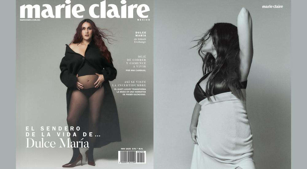La noticia del segundo embarazo de Dulce María se dio a conocer a través de una hermosa sesión de fotos para la revista Marie Claire, donde la cantante y actriz luce radiante. En las imágenes, se la ve posando en blanco y negro, mostrando con ternura su vientre de embarazada y reflejando la emoción por esta nueva etapa en su vida.