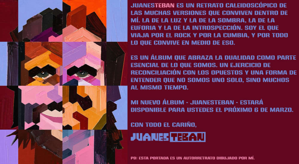 La portada de 'JuanesTeban', revelada hoy, fue completamente dibujada por Juanes como parte de una dirección creativa continua desarrollada junto a Sebastián Londoño y Juan Camilo Londoño. Además, cada canción del álbum contará con visuales ilustrados por el propio Juanes, marcando la primera vez que su arte original acompaña visualmente a un álbum.