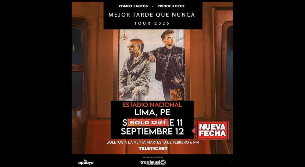 Los íconos mundiales de la bachata, Romeo Santos y Prince Royce, han confirmado una segunda fecha de concierto en el Perú, programada para el 12 de septiembre de 2026 en el Estadio Nacional de Lima, producto de la demanda extraordinaria y el apoyo masivo de sus fans peruanos, quienes agotaron rápidamente la primera presentación y exigieron una nueva oportunidad para vivir este espectáculo único. Esta ampliación del show confirma el poder de convocatoria y el amor que los seguidores han demostrado por la dupla artística.